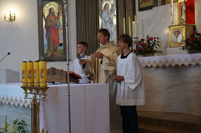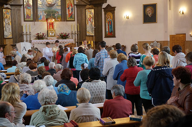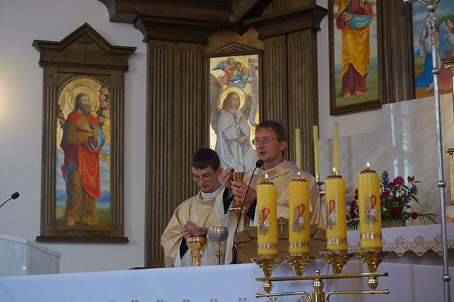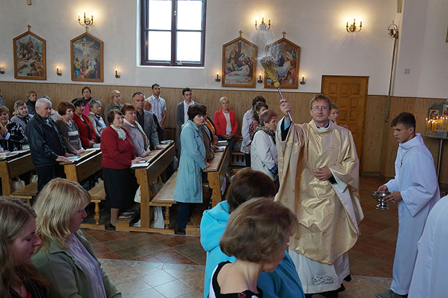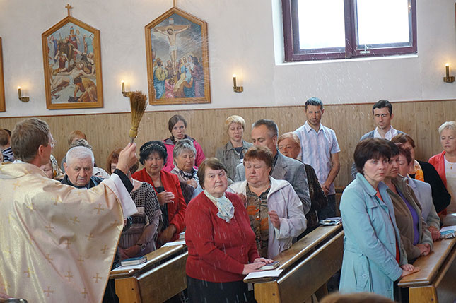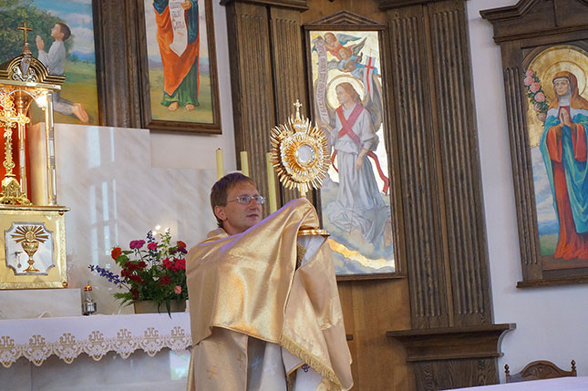 Паколькі надвор'е не дазволіла прайсці з працэссіяй па вуліцы - адарацыя Найсвяцейшага Сакрамэнту адбылася у касцёле. Але гэта не перашкодзіла прысутным перажыць настрой падзякі Богу за ласкі, атрыманыя у жыцці, сведчанні адданасці Хрысту і павагі да галоўнага Хлеба - Божага Цела ў Найсвяцейшым Сакрамэнце.