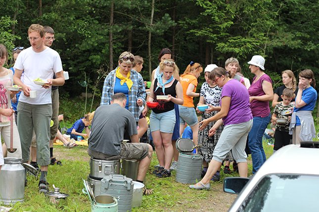 У другі дзень пілігрымавання ўжо які год запар абедам нас частуюць жыхары вёскі Корань. Яны прадастаўляюць нам сад, дзе можна пад кожным дрэвам разаслаць свой карэмат, пад’есці халадніку, сала з бульбай, смачнай выпечкі і шмат якіх яшчэ прысмакаў, прыгатаваных мясцовымі парафіянамі.