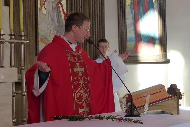 На літургію святары апранаюцца ў літургічнае адзенне чырвонага колеру. У гэты дзень падчас святой Імшы чытаецца або спяваецца з падзелам на ролі апісанне Мукі Хрыста. Таму другая назва Пальмовай нядзелі — нядзеля Мукі Пана. Нягледзячы на гэта, урачыстасць мае радасны характар, бо з яе пачынаецца літургічны ўспамін падзеяў, у якіх здзейснілася збаўленне свету.