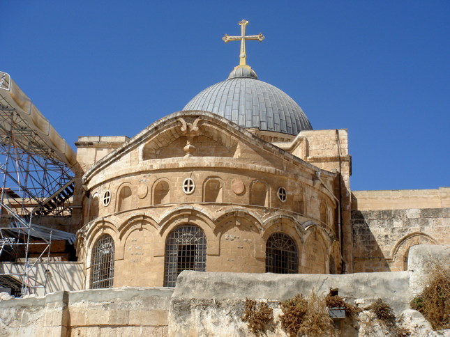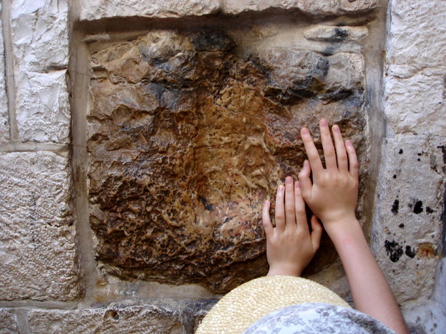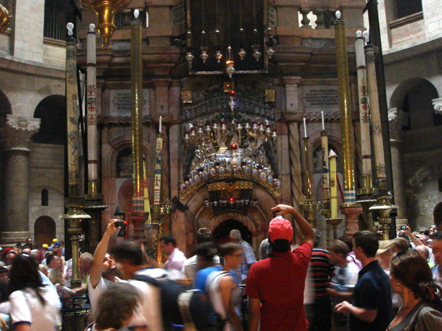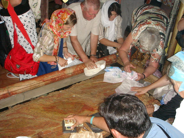 Камень Памазання, найстаражытнейшая хрысціянская святыня, першай паўстае перад кожным, хто ўваходзіць у Храм Уваскрэсення.