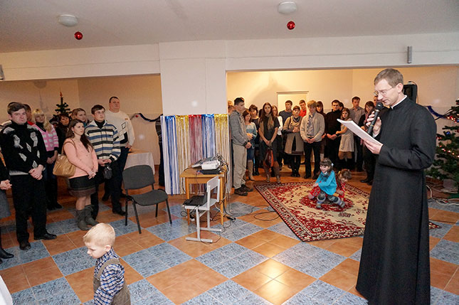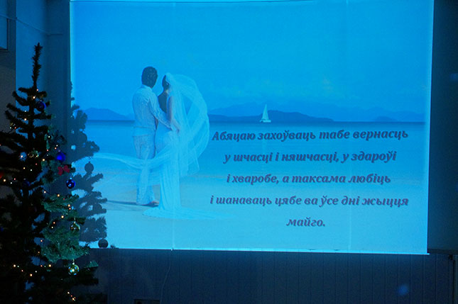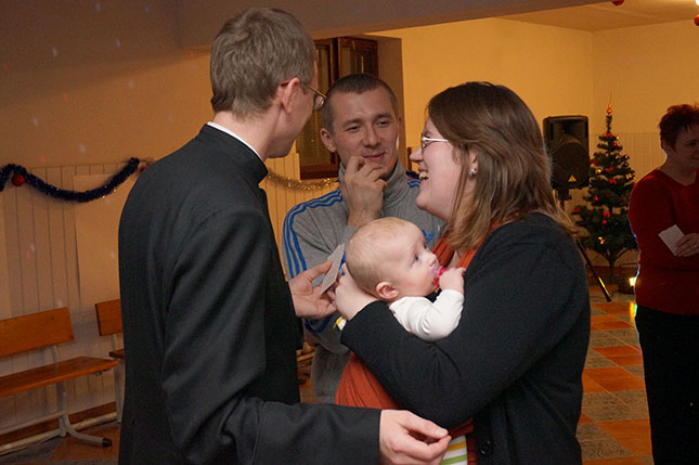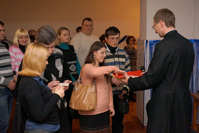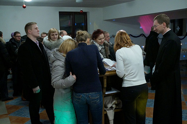 Вечарына пачалася з караценькай прамовы пробашча касцёла а.Міхаіла Цвячкоўскага, які вітаў прысутных і адзначыў: “Вялікая радасць бачыць тут сямейныя пары, добра, што муж і жонка разам прыйшлі ў касцёл. Асабліва цешыць усіх нас тое, што сёння тут шмат дзяцей. Усё разам гэта значыць, што сэрцы людзей адкрытыя да Бога, што дзякуючы такім сужэнцам у кожнай сям’і, у грамадстве становіцца болей павагі, любові адзін да аднаго, вернасці”.