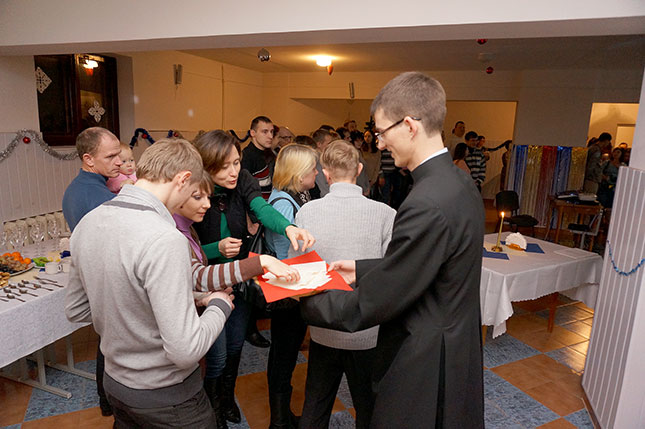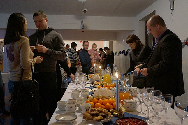 Спатканне было абвешчанае як аплаткавае, таму ўсе прысутныя абменьваліся адзін з адным аплаткамі, віншавалі адзін аднаго з Божым Нараджэннем і жадалі ўсяго найлепшага. Мелі прысутныя магчымасць і патанчыць, і паўдзельнічаць у вясёлых конкурсах, паразмаўляць са знаёмымі і пазнаёміцца з новымі людзьмі. Для парафіяльных сужэнцаў быў падрыхтаваны і сюрпрыз: вітаць іх прыехала з Францыі …”Патрысія Кас”, якая праспявала адзін са сваіх хітоў. Роля вядомай спявачкі добра ўдалася Кацярыне Падсаднай. Вядома ж, і маленькія госці вечарыны таксама не сумавалі, бо іх забаўляла касцёльная моладзь.