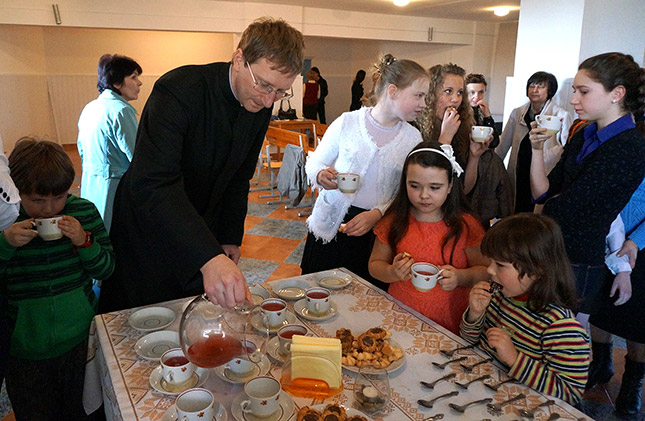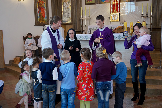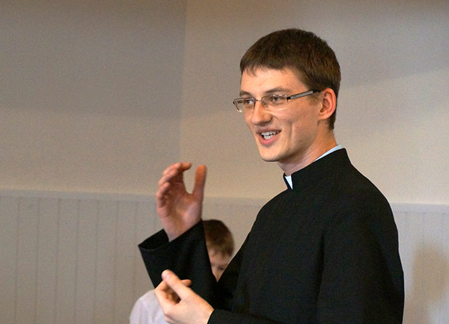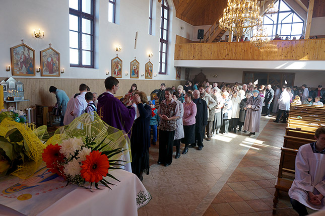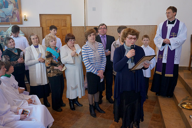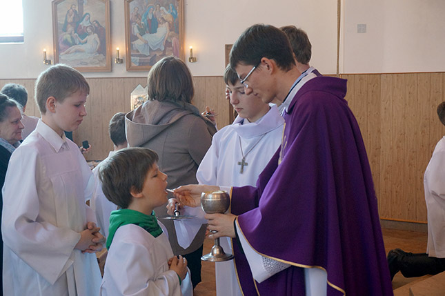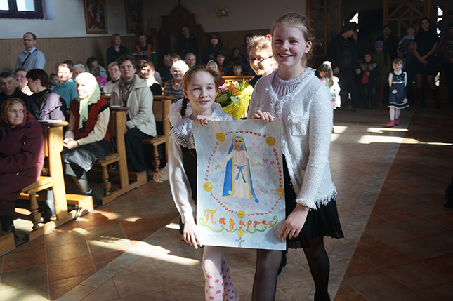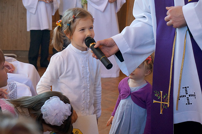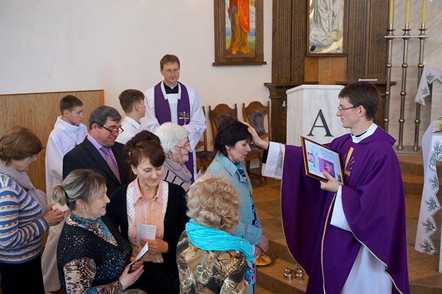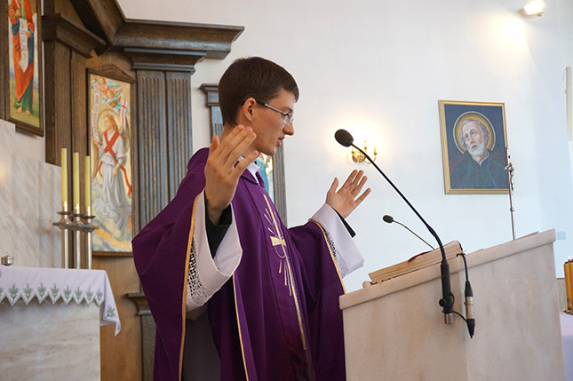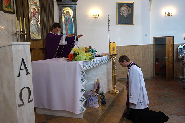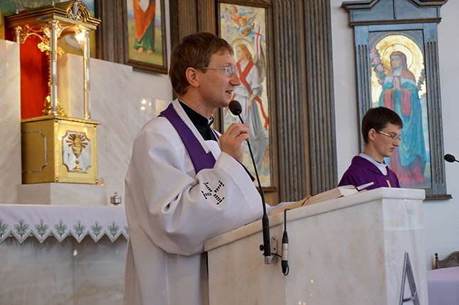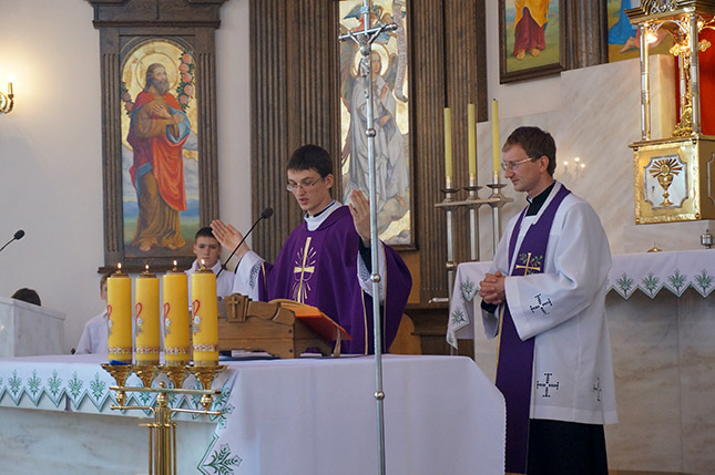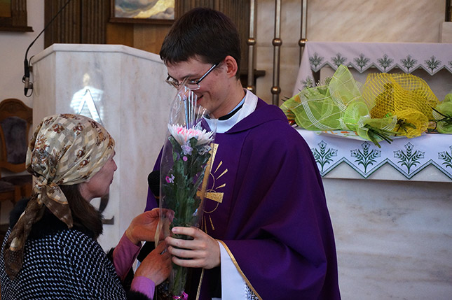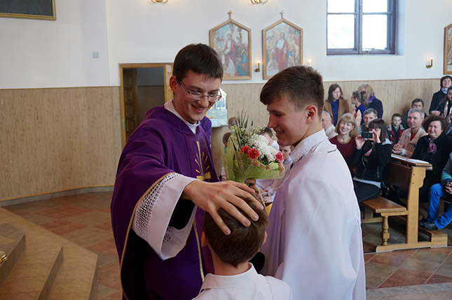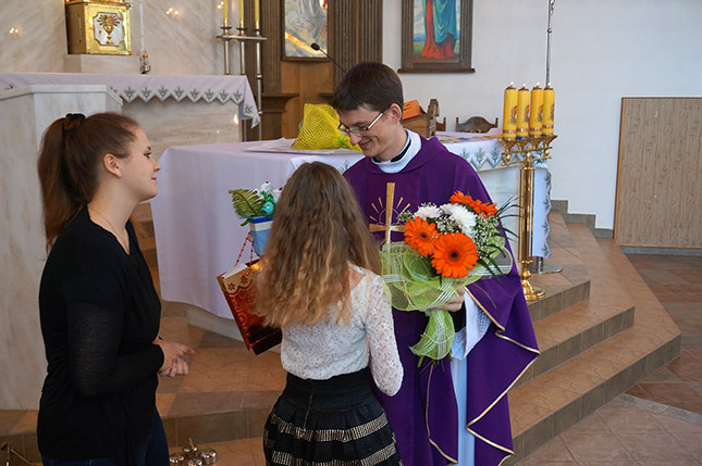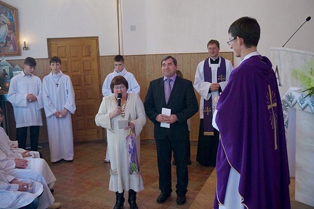 Прыміцыянта вітаў пробашч касцёла а.Міхаіл Цвячкоўскі: “Удзельнічаць у тваім шляху да святарства для мяне вялікая радасць. І сёння ўся парафія выказвае радасць, бо да гэтай радасці рыхтавалі свае сэрцы мы ўсе. Праца ксяндза – цяжкая, гэта паслуга ціхая, шэрая, але ты будзеш даваць людзям жывую ваду веры. Жадаю, каб у сваёй паўсядзённай працы ты ніколі не заняў месца Хрыста і каб хвалілі не цябе, а Хрыста, каторы ў табе, і каб праз цябе людзі сведчылі Яго”. Звярнуўшыся да парафіянаў, ксёндз Міхаіл заклікаў маліцца за маладога святара і зазначыў, што ў сэрцах вернікаў заўсёды павінна быць удзячнасць Богу за тых асобаў, што, адчуўшы пакліканне, адказалі Богу “так”.
